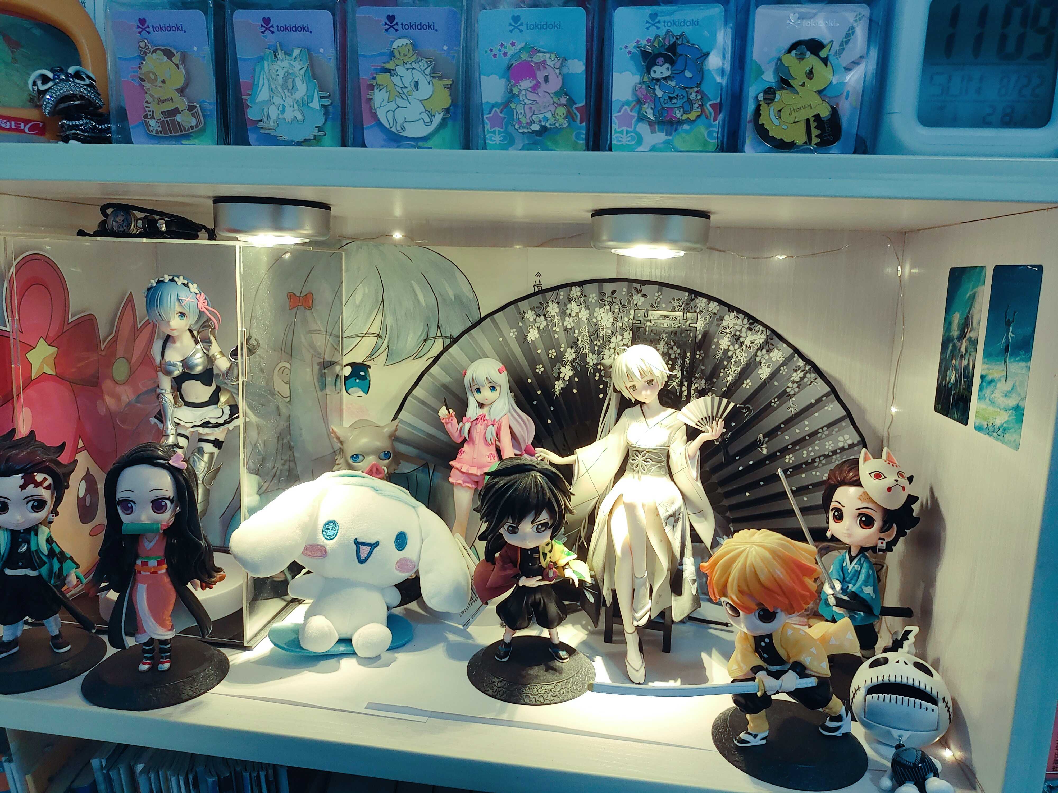下面一层是一些手办和摆件,当然,还有一只可爱的玉桂狗(Cinnamoroll)