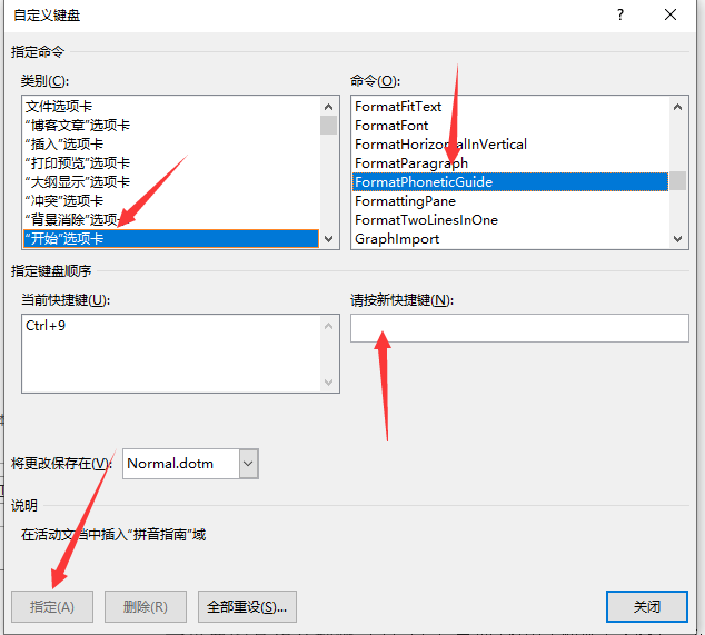 在类别中选择 开始选项卡,在命令中选择“FormatPhoneticGuide”,最后,设置成你喜欢的快捷键并且 指定(A)即可,比如此处我设置为 Ctrl+9 (请注意是否存在快捷键冲突)