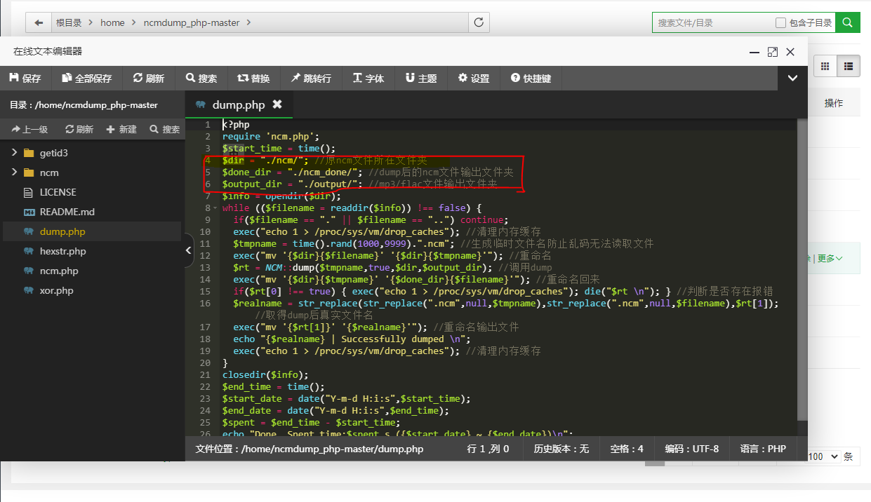 需手动修改PHP文件中的输入NCM路径,输出NCM路径,输出dump后文件路径