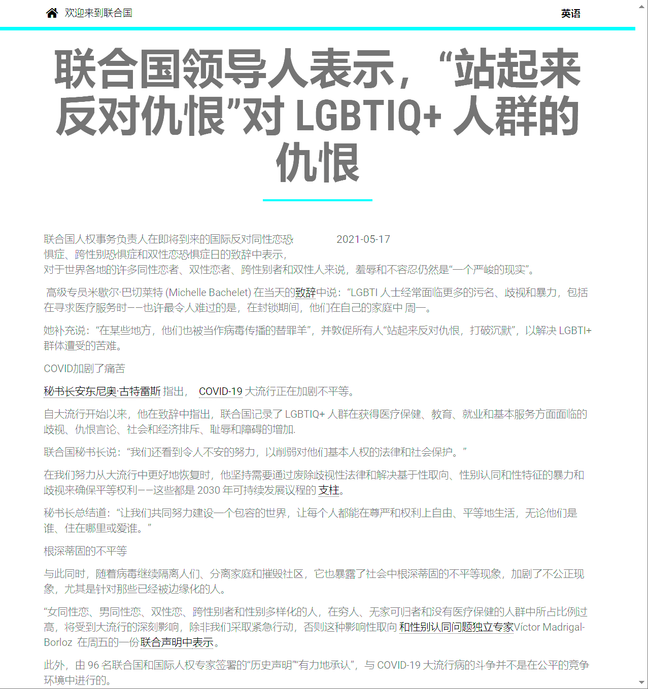 联合国领导人表示,“站起来反对仇恨”对 LGBTIQ+ 人群的仇恨