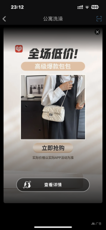 这是出现在结束洗澡功能页面中的一个弹出式广告,我们简单设想一下这个状态下的用户处于什么状态,着急结束扣费、双手湿漉、亦或者忙着洗衣服,而在这种状态下,无论广告的内容能够多吸引用户,我想也不会有人真的愿意去查看这个广告的内容(反倒是误触进入的用户会更多),这便是高质量广告的第一个要点——契合用户休闲状态时展出
