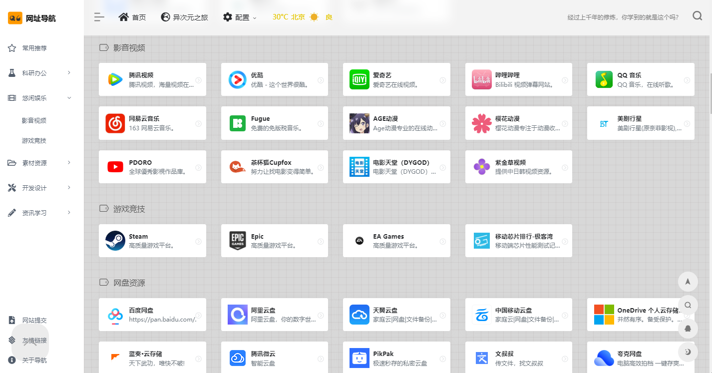 🗂️功能布局:导航整体分为 聚合搜索头部(整合百度,必应,软件,文献,知乎,淘宝,旅游,求职等全网资源搜索)以及导航栏目主体(共用6大主板块与22个子栏目)涵盖办公,学习,娱乐,设计,生产力以及各类效率型网站,可满足各类群体的不同需求。